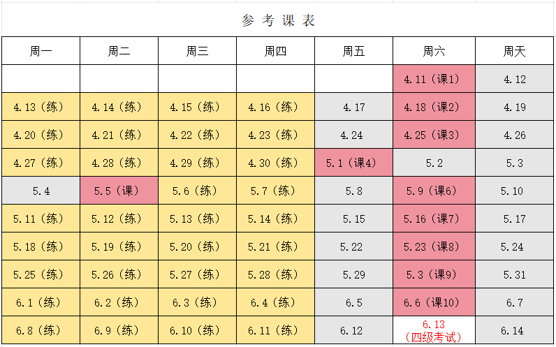讲:每周六9:00—12:00,合理利用周末时间,不耽误日常学习,稳步推进备考节奏,冲刺6月13日四级/六级实战考试见分晓!